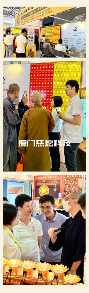 精耕多年,推陳出新,此次春季佛事展。慈愿帶來多款智能佛前蓮花燈以及祈福牌位等新品,在展位可掃碼體驗。